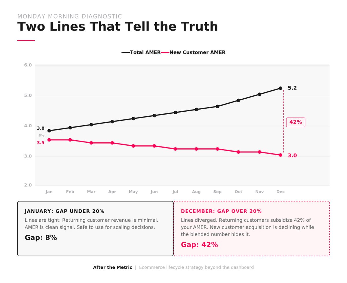I've watched brands use their Q1 AMER to justify their full-year media plan. They take that number into planning meetings and say "look, we were at a 5.8 in January." But that 5.8 was 40% returning customer revenue during the highest-reactivation period of the year. The real new customer number was closer to 3.5. Those are two completely different scaling trajectories, and they lead to two completely different P&L outcomes by Q3.