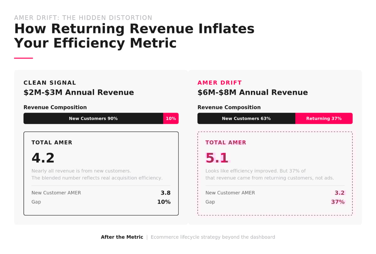 AMER drift is the gradual divergence between a brand's blended marketing efficiency ratio (total revenue divided by ad spend) and its actual new customer acquisition efficiency. As returning customer revenue grows from lifecycle channels and organic repurchase behavior, it inflates the blended ratio, making paid acquisition appear more efficient than it is. This typically becomes material when an ecommerce brand crosses $5M-$8M in annual revenue and returning customers represent 25% or more of total revenue.